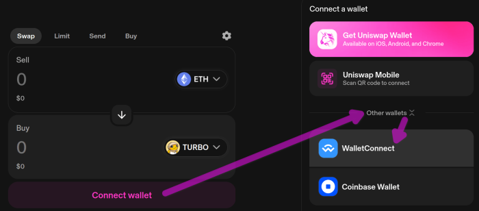 Follow the on-screen prompts to find the WalletConnect option, then scan the QR code on screen in your crypto wallet app. Next, approve the connection, and ensure everything is set up correctly. Once connected, you’ll be able to swap your $ETH or $USDT for Turbo.