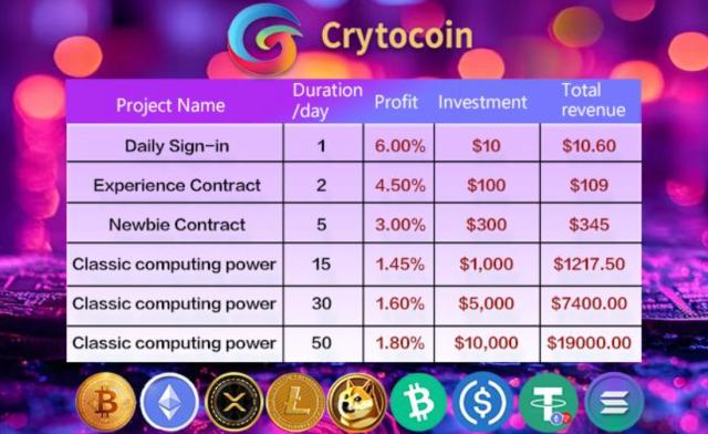 (The computing power value of the contract is different, the investment amount and term are different, and the income is also different. For more contracts, please log in to the Crytocoinminer official website to view)