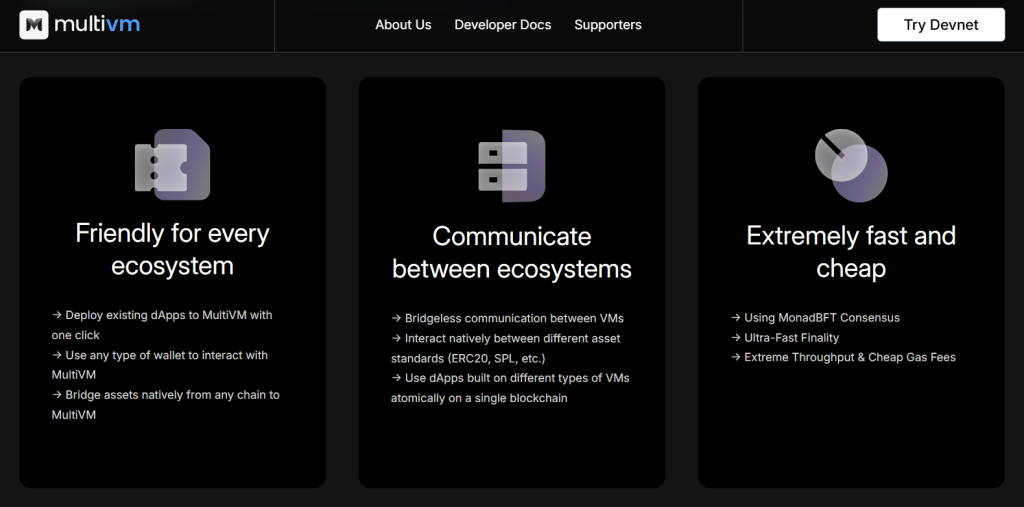 MultiVM využívá modulární architekturu, která umožňuje paralelní běh různých VM, přičemž síť zajišťuje vysokou škálovatelnost, nízké transakční poplatky a škálovatelnost. Díky tomu je vhodná pro projekty vyžadující flexibilitu, bezpečnost a možnost snadné migrace mezi různými blockchain ekosystémy bez přepisování kódu. Vývojáři tak mohou spustit dApps napsané například v Solidity nebo Rustu na jednom místě.