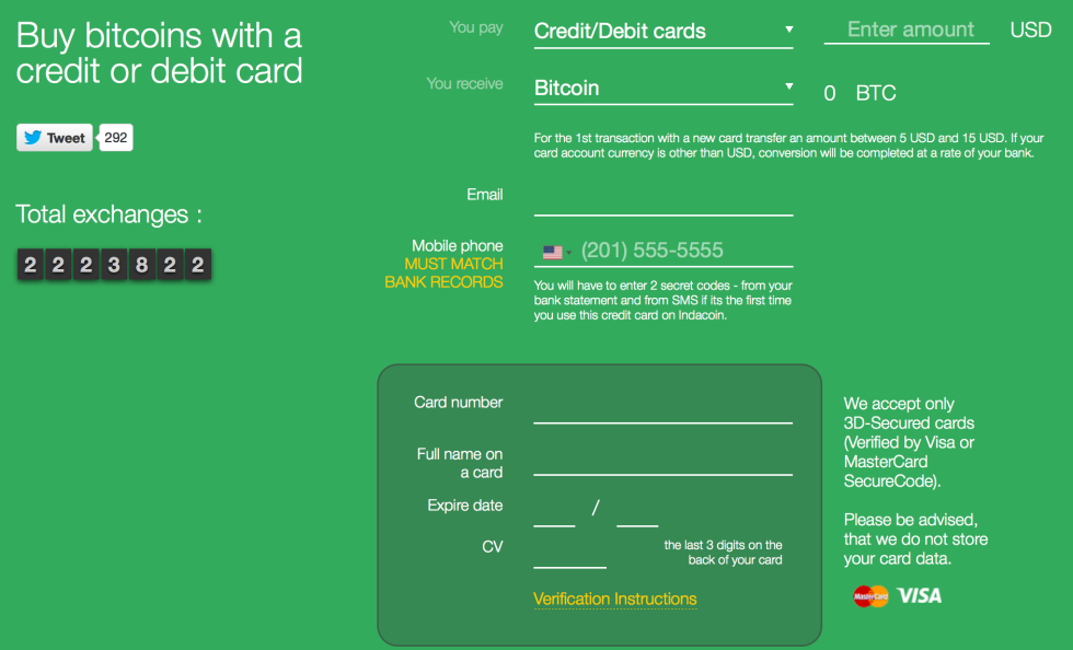 Indacoin Exchange found a safe and secure way to simplify and speed up the process by requesting a code from online bank statement and a text message It usually takes no more than 30 minutes to verify the card and receive bitcoins.