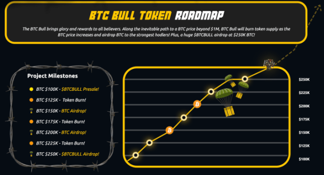 BTC Bull Token ($BTCBULL) blends meme coin energy with real Bitcoin exposure through airdrop-driven mechanics. The concept is simple but bold: as $BTC’s price hits certain milestones, $BTCBULL executes token burns and BTC giveaways to holders.