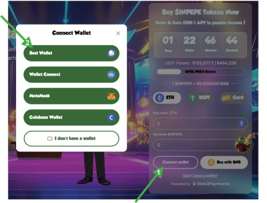 To buy $INPEPE, you’ll need to deposit compatible cryptocurrencies into your wallet – namely $ETH, $USDT, $BNB, or even use credit card payments via Best Wallet.