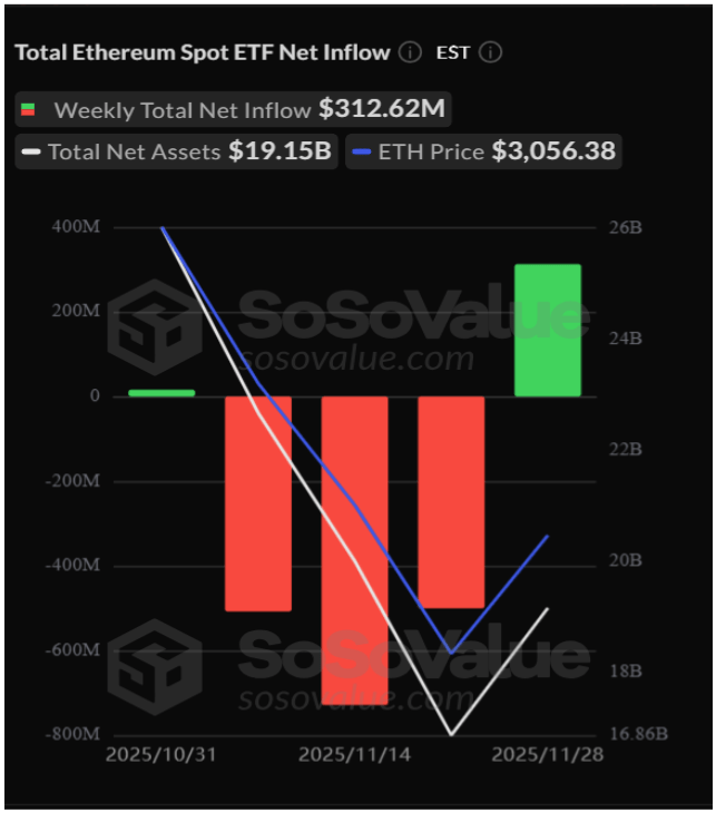 The size of Ethereum’s rebound stands out because the price of the leading altcoin had been under more intense pressure than Bitcoin throughout most of November. The fresh inflows point to a noticeable change in sentiment, especially among institutions that had previously paused ETH accumulation.