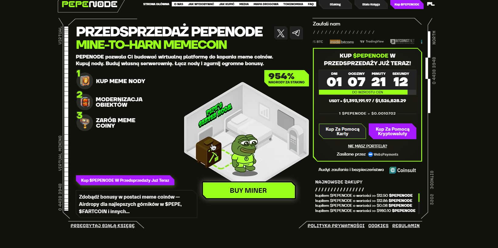 Pepenode (PEPENODE) to innowacyjne rozwiązanie sieciowe typu „mine-to-earn”, łączące kulturę meme z technologią blockchain. Użytkownicy mogą kupować wirtualne nody (węzły) i zarabiać tokeny za ich działanie. Koncepcja ta tworzy unikalny model „dzielenia się mocą”, przypominający zdecentralizowaną infrastrukturę chmurową, ale z zabawnym, „meme’owym” akcentem.