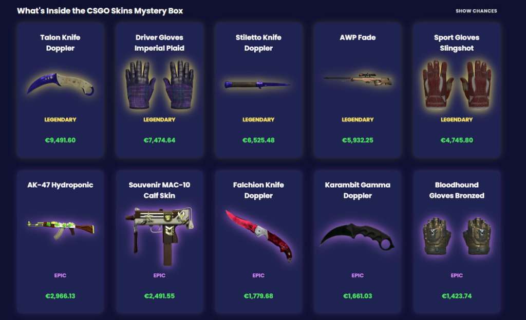 Stačí jedno kliknutí na Mystery Box a můžeš získat skiny za vysoké ceny na trhu. Proto hráči po celém světě milují Mystery Boxy. Nabízejí šanci získat top skiny CS:GO bez nutnosti velkých investic.