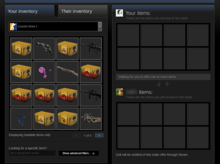 Skiny můžeš také směňovat přímo s ostatními hráči přes obchodní nabídku na Steamu. Tento způsob je flexibilní a umožňuje individuální dohodu, často i výhodnější než při přímém nákupu. Rizikem ale je možnost podvodu, zejména při jednání s neznámými profily. Také je potřeba mít přehled o tržní hodnotě skinů, aby ses nenechal napálit. Obecně se doporučuje nikdy neprovádět výměny mimo oficiální rozhraní Steamu.