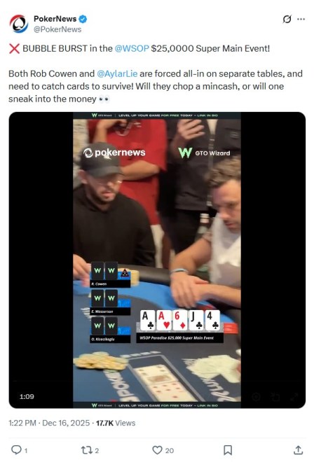 $25,000美元WSOP Paradise Super Main Event的泡沫階段也正式破裂。Rob Cowen與Aylar Lie同時在石泡沫位被淘汰,並平分$50,000美元的最低獎金。