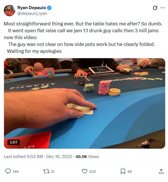 Ryan Depaulo隨後表示:「他是被混亂的情況害到沒錯,但他確實已經棄牌了,Martin。很抱歉,兄弟,這對你來說真的很糟,但你已經棄牌了。」