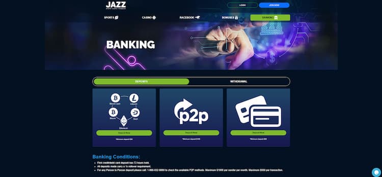 Some banking options on Jazz Sportsbook include cryptocurrencies (BTC, LTC, DASH, BTC, ETH), Person2Person transfer, and credit/debit cards. All deposits – as with other giants like BetOnline and Bovada – have a 1x rollover requirement. Debit/credit card deposits have a 72-hour hold.
