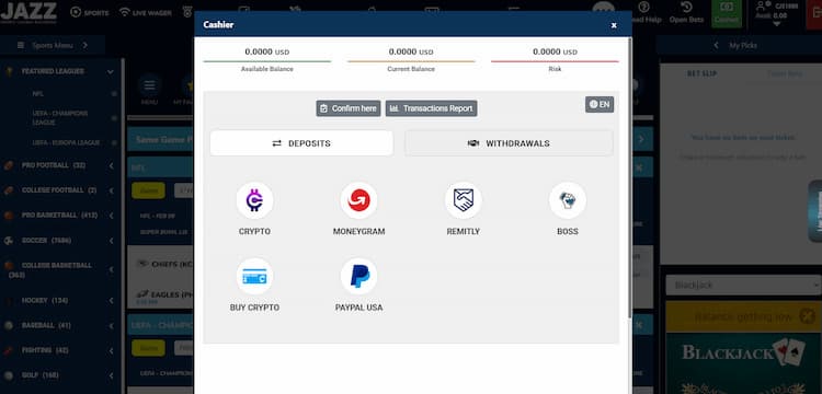 Login to Jazz Sports ag with the approved details afterward. Click the cashier button and select ‘Deposit’ next. Choose any payment option of your choice and deposit at least $100 to qualify for the bonus.