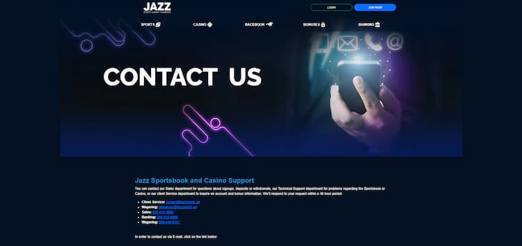 Jazz Sports ag offers 24/7 customer service to address any inquiries or issues you may encounter. You can reach the sportsbook’s support team through email, the Jazz Sports phone number, or live chat. A positive is that the wait time on Jazz’s Sports phone number was shorter than with many other sportsbooks we’ve tried.