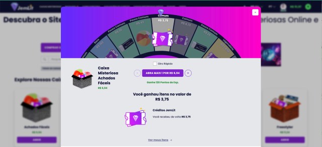 Depósito JemLit - Comprar caixa misteriosa: Com os créditos na conta, basta escolher uma caixa misteriosa. Existem diversas categorias, como tecnologia, PlayStation, Apple, videogames, celulares, entre outras.