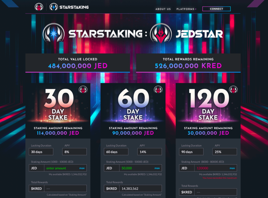 We are excited to announce the launch of STARSTAKING, a new DeFi platform that offers innovative staking solutions and rewards in KRED, the native token of JEDSTAR Gaming’s ecosystem. With up to 25% annual percentage yield (APY), one of the highest in the market, STARSTAKING sets itself apart as a unique investment opportunity.