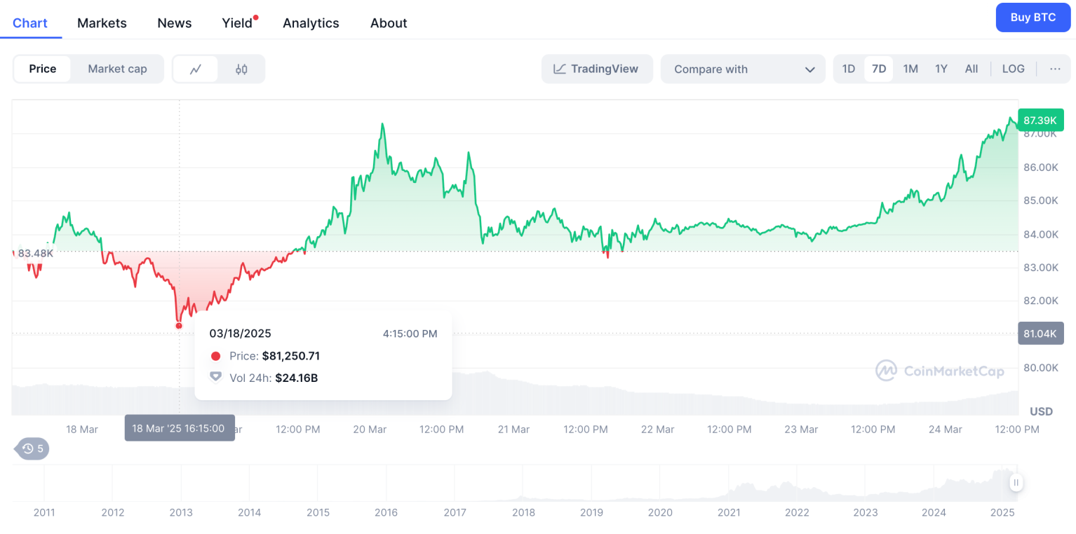 Harga $BTC juga mengalami lonjakan usai konferensi pers di Oval Office. Berdasarkan data dari Coinbase, volume perdagangan Bitcoin dalam 24 jam terakhir meningkat sebesar 143,4%. Saat ini, harga $BTC berada di level $87.700.