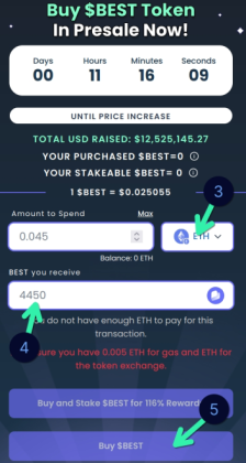 За да инвестирате в предварителната продажба на $BEST, посетете на официалния сайт, свържете крипто портфейла си с уиджета за предпродажба, изберете метод за покупка и броя токени, които искате да купите, и потвърдете транзакцията в портфейла си.