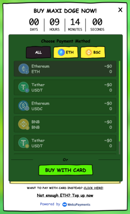 Уверете се, че имате средства в портфейла си. Можете да купите $MAXI с криптовалути ($ETH, $USDT, $USDC, $BNB) или с банкова карта. Изберете желания метод, като кликнете върху предпочитаната криптовалута или върху „Buy With Card“.