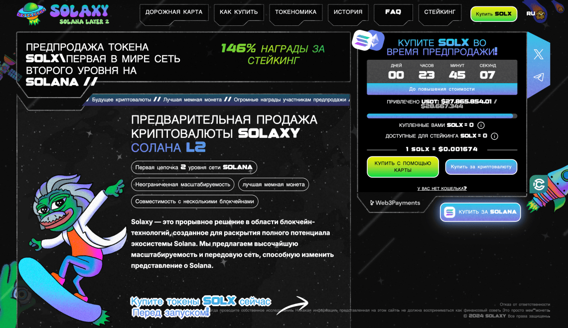 Учитывая, что Solana занимает третье место среди крупнейших криптовалют, несмотря на существующие проблемы, $SOLX может стать одним из самых перспективных альткоинов на рынке с огромным потенциалом роста.