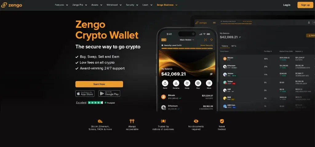 Varnost temelji na razdelitvi zasebnega ključa med vašo napravo in strežnike Zengo, kar odpravi tveganje izgube enega ključa. Poleg tega denarnica ponuja 3FA zaščito (trifaktorska avtentikacija) – 3D prepoznavanje obraza, e-poštno preverjanje in šifrirano varnostno kopijo v oblaku.