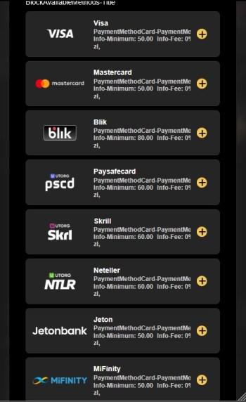 - Złóż depozyt – kliknij ikonę depozytu i wybierz metodę wpłaty. Masz do wyboru kryptowaluty, karty płatnicze (VISA i MasterCard), przelewy BLIK, kody PaysafeCard oraz e-portfele (MiFinity, Jeton, Neteller, Skrill). Uważaj, na wpłaty portfelami Neteller i Skrill, które wykluczają z promocji powitalnej.