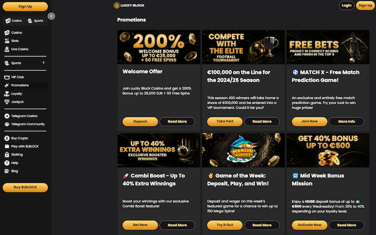- Lucky Block – 200% depozīta atbilstība līdz $25,000 & 50 bezmaksas griezieni