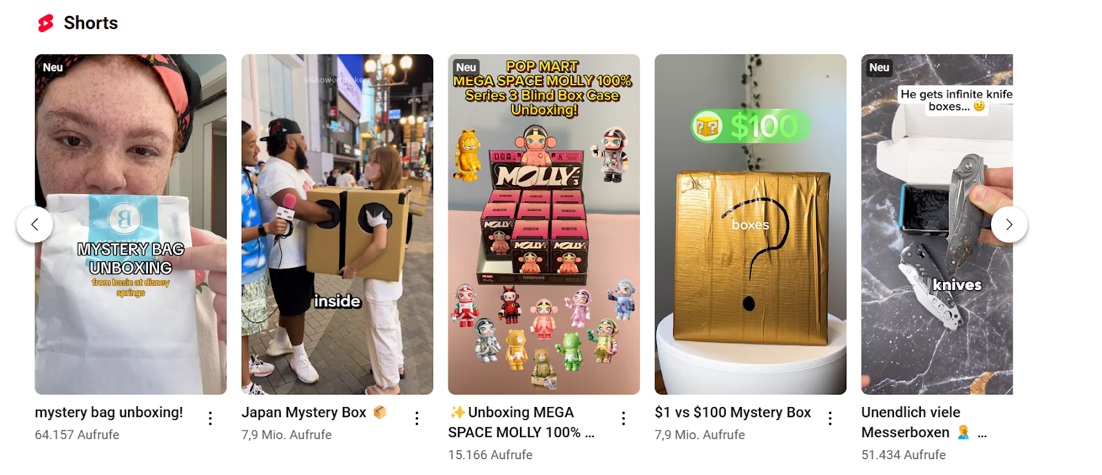 Auch im Bereich der Lootboxen – die ursprünglich aus Videospielen bekannt sind – und der Mystery-Box-Konzepte gibt es ein breites Meinungsspektrum. In YouTube-Videos oder TikTok-Clips zeigen Nutzerinnen und Nutzer das Unboxing ihrer gekauften Boxen.