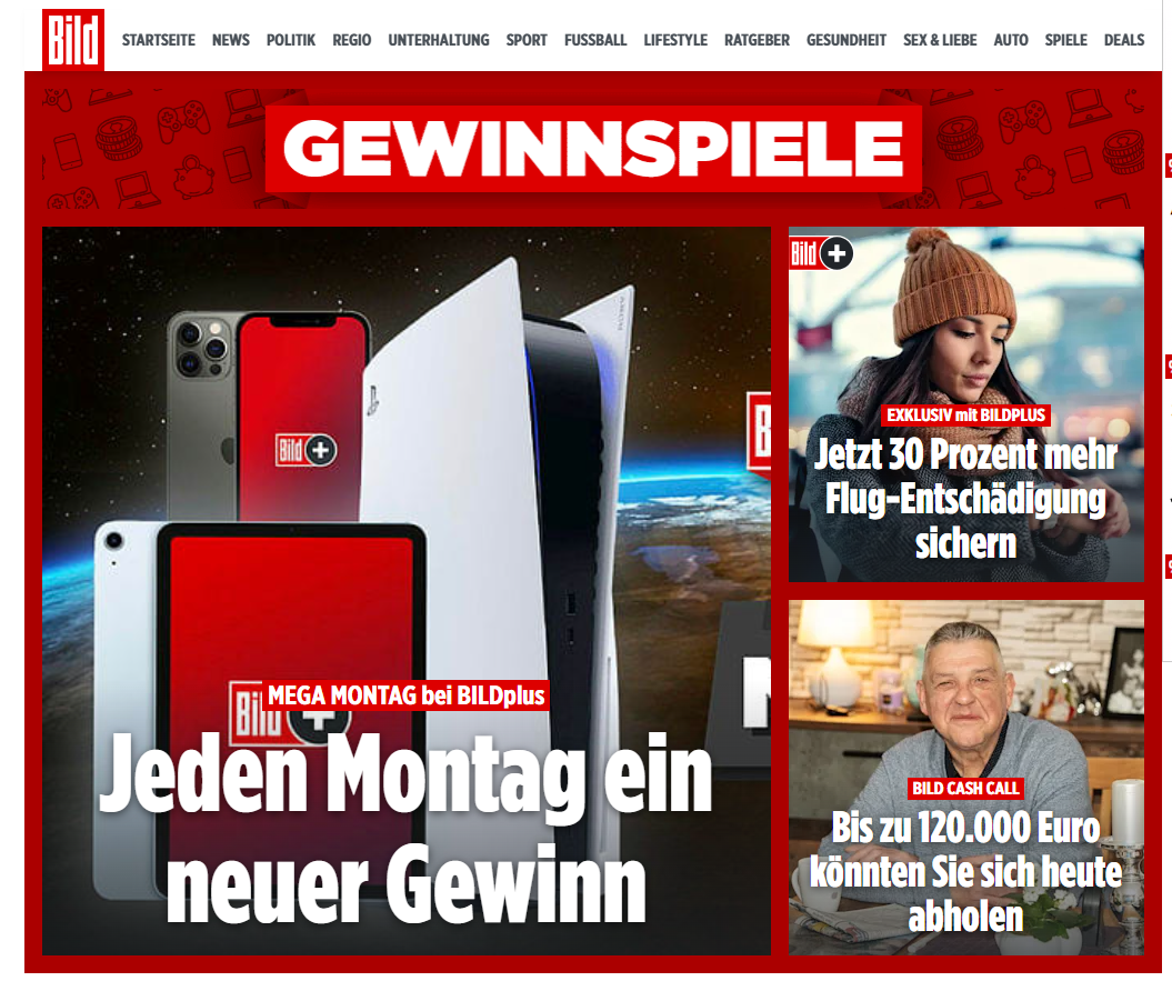 Auch die deutsche Bild hat ein breites Gewinnspielportal, Quelle: https://www.bild.de/bildplus/gewinnspiel/