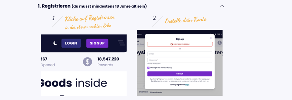 - Bezahlung: Anders als bei einem rein kostenlosen Gewinnspiel zahlen Sie hier einen Fixpreis für die Box. Dafür muss zuerst Guthaben auf Ihr Konto gebucht werden, welches mittels Paypal, Kreditkarte oder auch alternativ über Krypotwährungen eingezahlt werden kann. Das ist quasi die Eintrittskarte zum Überraschungseffekt.