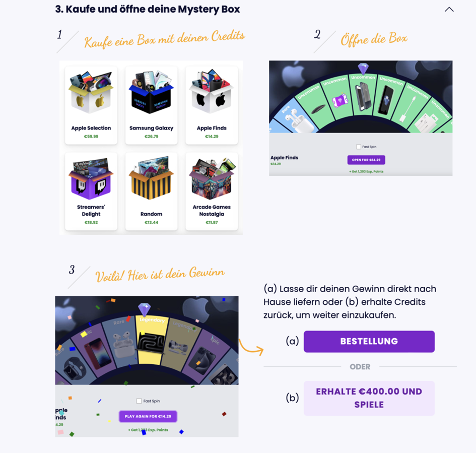 Eine Plattform mit lootbox-ähnlichem Konzept, bei dem Nutzerinnen und Nutzer dank Zufallsmechanik Artikel aus Bereichen wie Elektronik, Luxus oder Mode gewinnen und das Ergebnis virtuell direkt sehen, bevor sie den Gewinn nach Hause geschickt bekommen. - Online-Gewinnspielportale