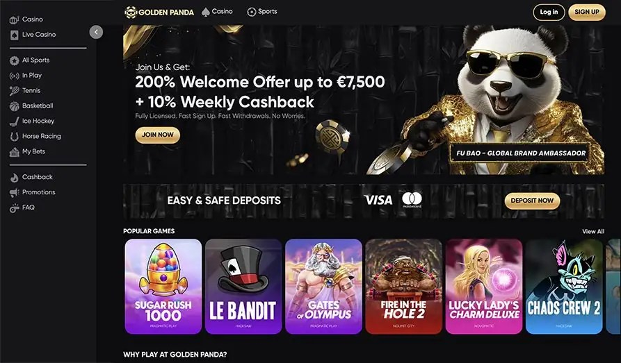 Освен казиното, Golden Panda разполага с обширен спортен букмейкър с над 32 пазара за спортни залагания. Можете да залагате на големи спортове като футбол, конни надбягвания и тенис с опции като 1×2, хендикап, общ брой точки и точен резултат.
