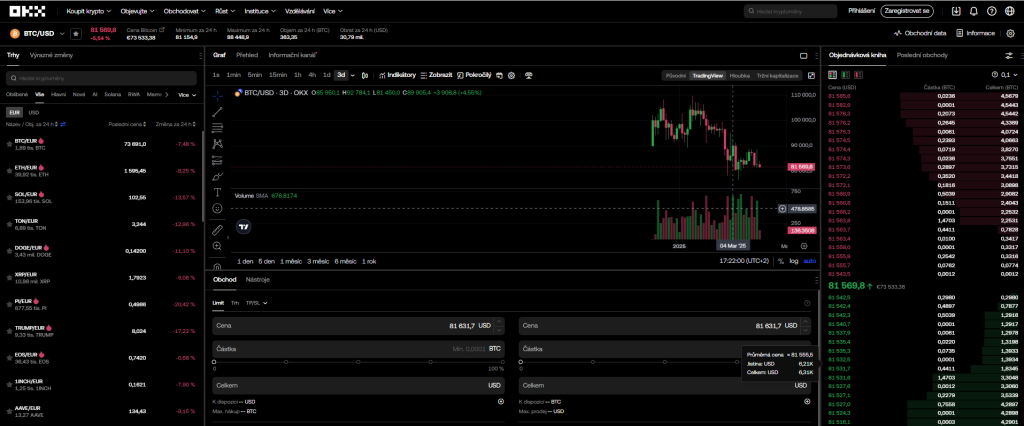 OKX je kryptoměnová burza, která nabízí obchodování s více než 350 kryptoměnami, včetně spotových a futures obchodů, opcí, P2P obchodování a NFT. K dispozici jsou také pokročilé nástroje jako copy trading, trading bot a staking. Platforma je přístupná přes mobilní aplikaci a web, což umožňuje efektivní správu investic pro začínající i zkušené obchodníky.