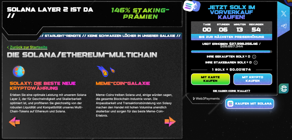Ein spannendes Beispiel für einen solchen Coin, der sich heute noch vor seiner ersten potenziellen Rallye befindet, ist dabei derzeit unter anderem SOLX. Der Coin ist sogar so jung, dass er derzeit nur über die offizielle Webseite des dahinterstehenden Projekts Solaxy und dort im Presale-Widget erworben werden kann. Hier wird Anlegern aktuell noch die Möglichkeit geboten, zu einem rabattierten Festpreis zu investieren und sich so einen möglichst frühen und günstigen Einstieg in das Projekt zu sichern.
