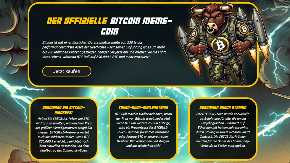 Ein spannendes Beispiel für einen solchen Coin stellt heute unter anderem BTCBULL dar. Das ist ein junger Bitcoin-Meme-Token, mit dem Anleger eine Wette auf Bitcoins zukünftige Wertentwicklung eingehen können sollen. Das wichtigste Feature des dahinter stehenden Projekts Bitcoin Bull ist nämlich ein AirDrop-Mechanismus, für den man sich mit dem Kauf von BTCBULL automatisch qualifiziert.