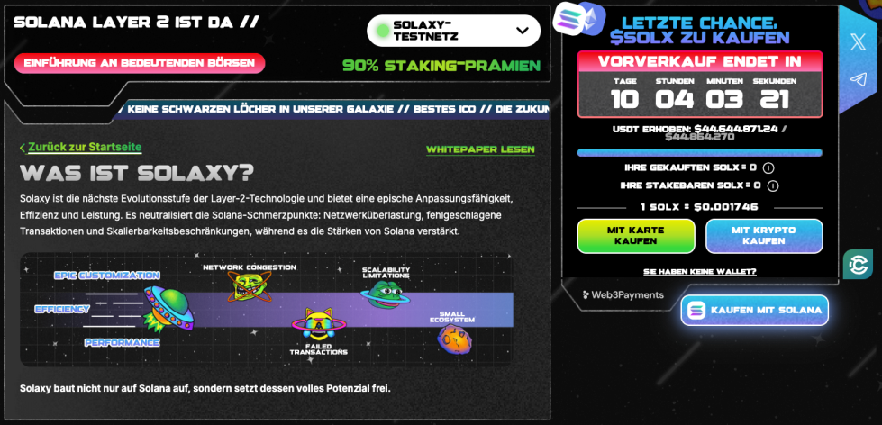 Hier wird SOLX gerade noch zum rabattierten Festpreis von 0,001746 $ verkauft und bis heute kam bereits über 44,6 Millionen $ an Vorverkaufsfunding von interessierten Anlegern zusammen, die sich den Coin noch frühestmöglich sichern wollen. Der Presale wird nur noch circa zehn Tage andauern, und dementsprechend beginnt gerade ein regelrechter Run auf die letzten Presale-Coins.