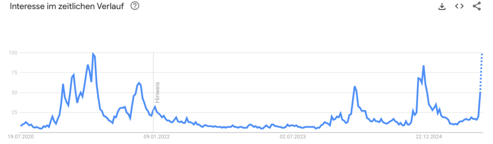 Seitdem war es jedoch zwischenzeitlich bereits wieder auf 10 Punkte zurückgefallen. Im Verlauf des Julis schoss das Interesse jedoch regelrecht in die Höhe und liegt heute bereits wieder bei 45 von 100 Punkten. Sollte sich dieser Trend fortsetzen, könnte es bis Anfang August sogar die vollen 100 Punkte erreichen.