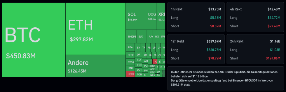 Die meisten Trader scheinen nicht mit dieser Entwicklung gerechnet zu haben. Das zeigt sich unter anderem in den massiven Liquidationen, welche es am Krypto-Markt innerhalb der letzten 24 Stunden gab. Zum ersten Mal seit Langem wurden innerhalb von 24 Stunden wieder über 1 Milliarde $ an Positionen liquidiert.