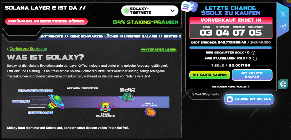 Somit hat das Projekt das Potenzial, starke Utility für das Solana-Ökosystem zu bieten, und viele Anleger scheinen von dem Konzept überzeugt zu sein. Obwohl sich SOLX nämlich noch vor seinem ersten offiziellen Börsenlisting Presale befindet, wurden von Anlegern schon fast 50 Millionen $ an Kapital investiert, und die Zuflüsse in den Presale steigen stetig weiter an. Anleger können SOLX hier gerade noch zum rabattierten Kurs von 0,001756 $ kaufen. Zudem steht auch die Möglichkeit, die im Presale erworbenen Coins im Anschluss für eine jährliche Rendite von bis zu 84 % zu staken.