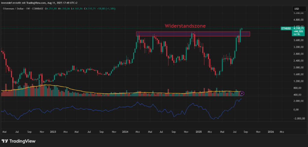 (Der starke Anstieg von Ethereum in den letzten Tagen hat den Kurs über seinen stärksten Widerstand im Wochenchart geführt – Quelle: