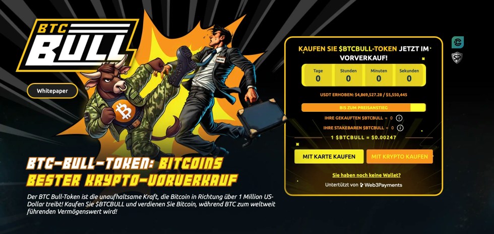 Das Konzept findet bei Anlegern Anklang, da man hier auch profitieren könnte, wenn der $BTCBULL-Kurs nicht steigen sollte. Immerhin erhält man die Airdrops auf jeden Fall, wenn der Bitcoin-Kurs steigt. Bei jedem weiteren 25.000 Dollar Schritt, den Bitcoin macht, werden abwechselnd Token-Burns und Bitcoin-Airdrops durchgeführt, was den $BTCBULL-Kurs auch explodieren lassen könnte, sodass Anleger doppelt profitieren würden. Aktuell ist der Coin noch im Vorverkauf erhältlich und schon jetzt haben Anleger fast 5 Millionen Dollar investiert, was darauf hindeutet, dass der Kurs nach dem Listing an den Börsen durch die Decke gehen könnte.