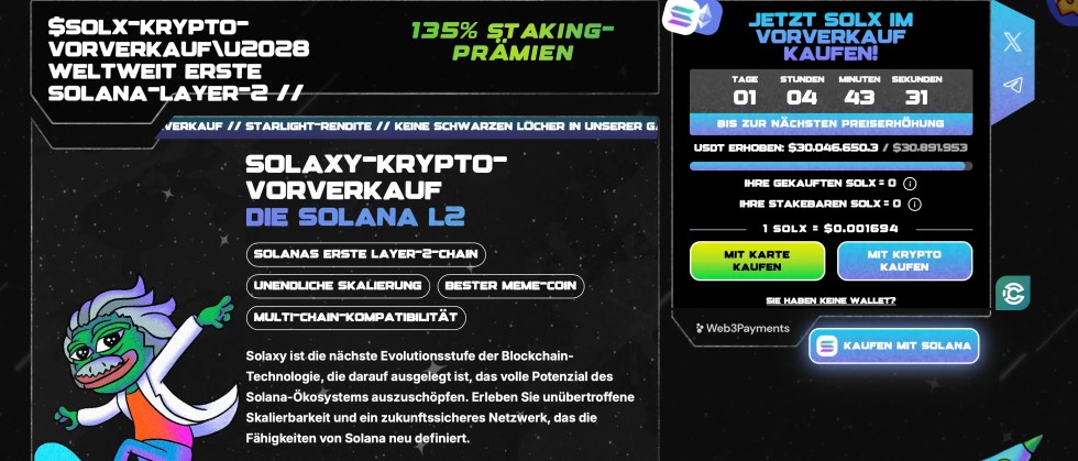 Der dazugehörige Token $SOLX wird zukünftig essenziell für jede Transaktion im Solaxy-Netzwerk sein. Ob Gebühren, Staking oder DEX-Handelspaare, $SOLX bildet das Herzstück des neuen Layer-2-Ökosystems. Noch ist der Token im Vorverkauf erhältlich, allerdings nicht mehr lange zum aktuellen Preis, denn eine Preiserhöhung steht kurz bevor. Frühe Investoren können hier also schon einen ersten Buchgewinn vor dem Handelsstart an den Börsen erzielen. Inzwischen wurden über 30 Millionen Dollar im laufenden Presale investiert, was ein klares Zeichen für das enorme Potenzial ist, das hier schlummert.