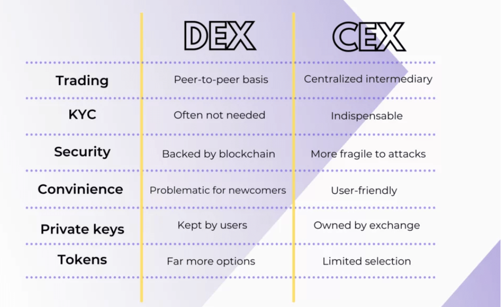 Na druhou stranu decentralizované burzy fungují bez centrální autority, jsou založené na blockchainových protokolech a kladou důraz na soukromí a vlastní správu prostředků. Podpora nových kryptoměnových předprodejů je dalším z bonusů.