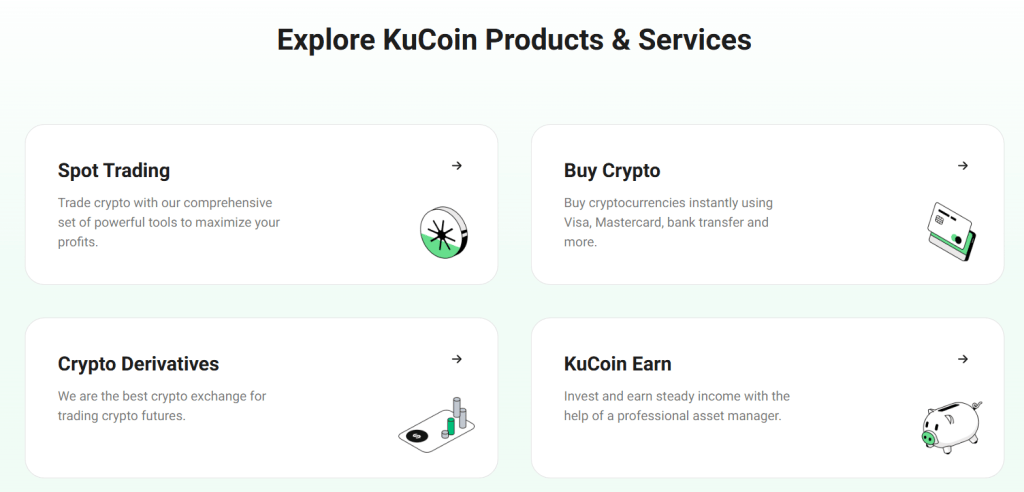 Tato platforma nabízí celou řadu produktů a služeb, včetně spotového obchodování, futures kontraktů, margin tradingu, copy tradingu, stakingu a dalších nástrojů pro pasivní příjem. Obchodníci mohou využívat pákové produkty s pákou až 100x a obchodovat s více než 700 kryptoměnami a 1 200 obchodními páry. KuCoin také poskytuje automatizované obchodní nástroje, jako jsou obchodní boty, které mohou fungovat 24/7, a umožňuje půjčování kryptoměn, což zajišťuje další možnosti pro pasivní příjem.
