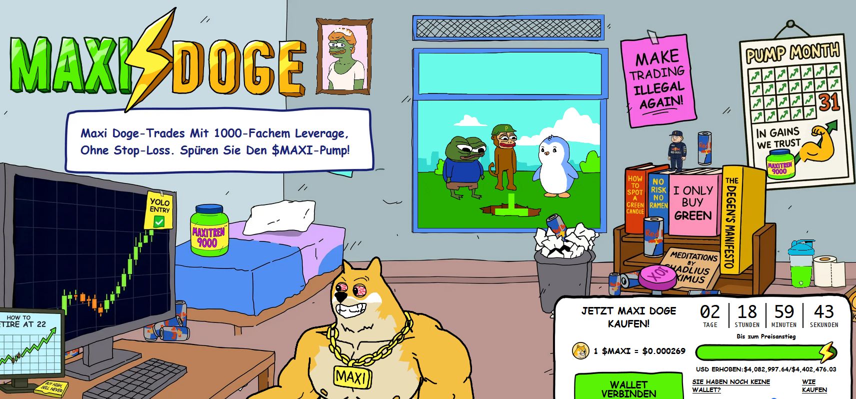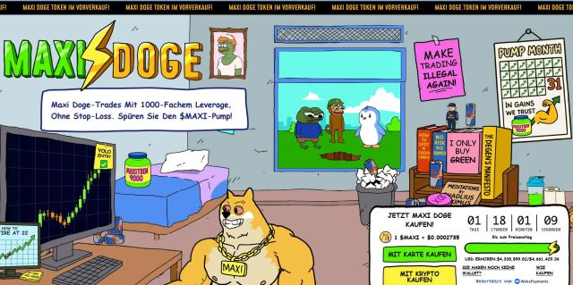 - Maxi Doge – Moderner Gym-Bro-Humor trifft auf klassische Meme-Coin-Ansätze