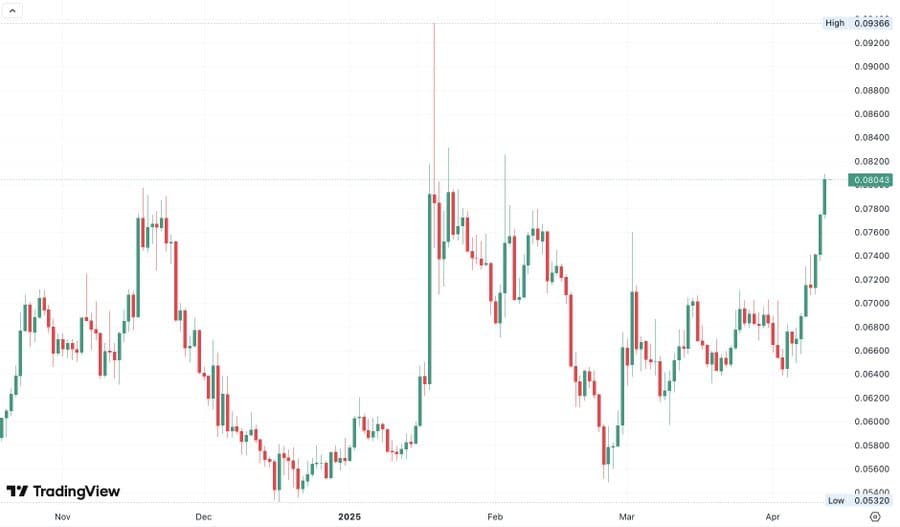 Anche la coppia SOL/ETH ha registrato u’impennata. Nelle ultime 24 ore, il grafico SOL/ETH ha chiuso sopra i 0,08043 dollari, toccando un nuovo massimo storico. Il traguardo segna un chiaro spostamento di capitale verso Solana.