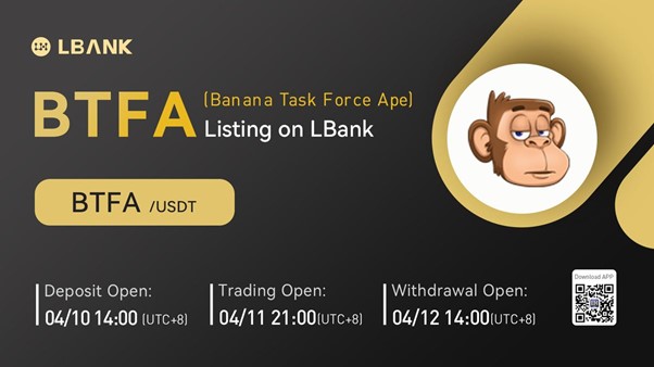 INTERNET CITY, DUBAI, Apr. 7, 2022 – LBank Exchange, a global digital asset trading platform, will list Banana Task Force Ape (BTFA) on April 11, 2022. For all users of LBank Exchange, the BTFA/USDT trading pair will be officially available for trading at 21:00 (UTC+8) on April 11, 2022.