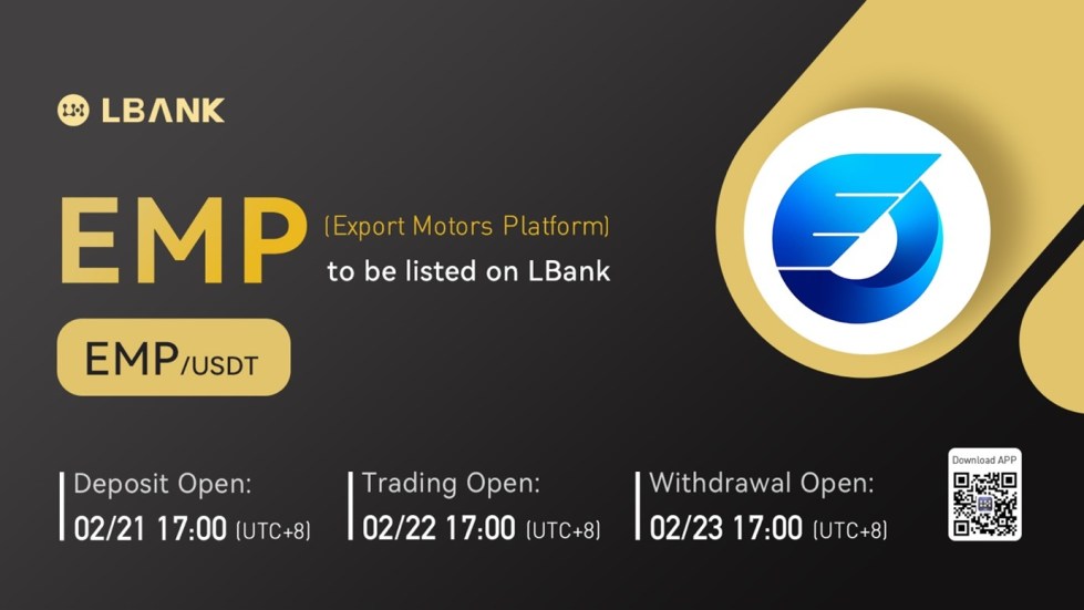 INTERNET CITY, DUBAI, Feb. 17, 2022 – LBank Exchange, a global digital asset trading platform, will list Export Motors Platform (EMP) on February 22, 2022. For all users of LBank Exchange, the EMP/USDT trading pair will be officially available for trading at 17:00 (UTC+8) on February 22, 2022.