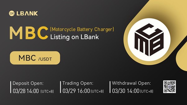 INTERNET CITY, DUBAI, Mar. 24, 2022 – LBank Exchange, a global digital asset trading platform, will list Motorcycle Battery Charger (MBC) on March 29, 2022. For all users of LBank Exchange, the MBC/USDT trading pair will be officially available for trading at 16:00 (UTC+8) on March 29, 2022.
