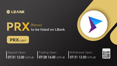 INTERNET CITY, DUBAI, Jul. 26, 2022 – LBank Exchange, a global digital asset trading platform, will list Parex (PRX) on July 28, 2022. For all users of LBank Exchange, the PRX/USDT trading pair will be officially available for trading at 16:00 (UTC+8) on July 28, 2022.