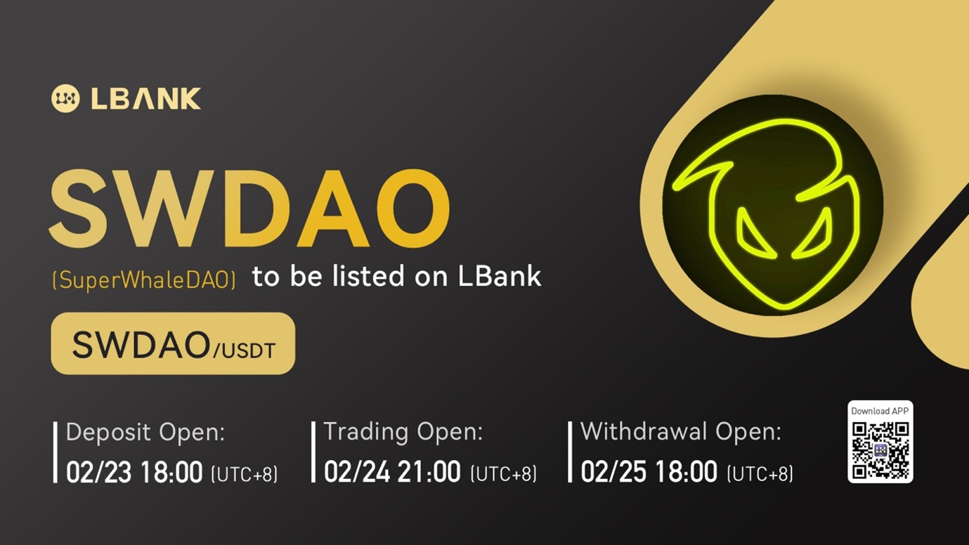 INTERNET CITY, DUBAI, Feb. 22, 2022 – LBank Exchange, a global digital asset trading platform, will list Super Whale DAO (SWDAO) on February 24, 2022. For all users of LBank Exchange, the SWDAO/USDT trading pair will be officially available for trading at 21:00 (UTC+8) on February 24, 2022.