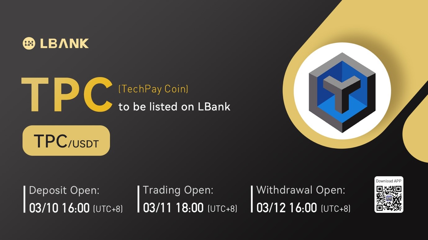 INTERNET CITY, DUBAI, Mar. 3, 2022 – LBank Exchange, a global digital asset trading platform, will list TechPay Coin (TPC) on March 11, 2022. For all users of LBank Exchange, the TPC/USDT trading pair will be officially available for trading at 18:00 (UTC+8) on March 11, 2022.