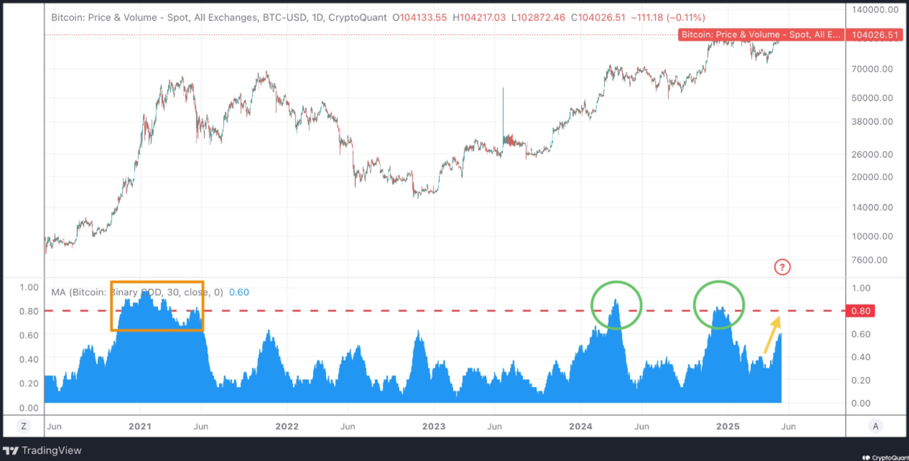 Durante i precedenti rally di Bitcoin, tra cui quello alla fine del 2021 e i due picchi del 2024, l’indicatore ha superato la soglia di 0,8.